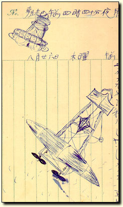 Today I went to Karahashikun's house and we went with Yoritakakun together to fly our planes. But this time it was a flop and I was sad. Tomorrow I hope to rebuild a good one. There were other people flying their planes too. Everyone else had success. I drew a picture of my friend's plane on this page. His plane too was successful and I was very jealous of him. the end